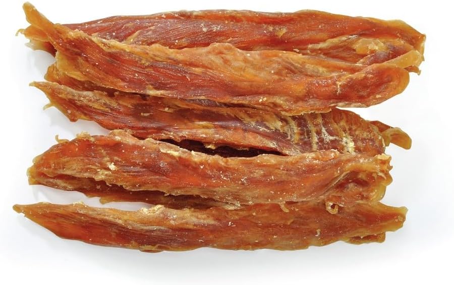 Dried chicken strips, a chewable complementary food for dogs, gluten-free and additive-free.