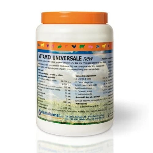 Chemifarma's Vitamix Universale is indicated to improve and optimize the nutrition of birds and farm animals in various situations. It is particularly recommended in periods of stress such as moulting, convalescence, and transport, as well as during antibiotic treatments. The product is effective in preventing and treating eggshell fragility, pica and cannibalism, and egg fragility. bone and weakness. Furthermore, it is useful for improving the quality and shine of the coat or livery and for supporting high production such as brood.