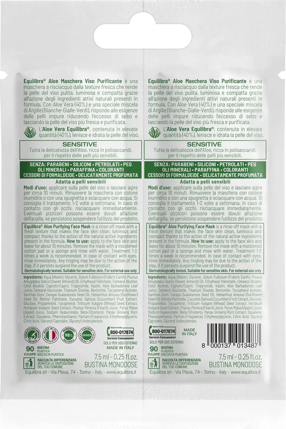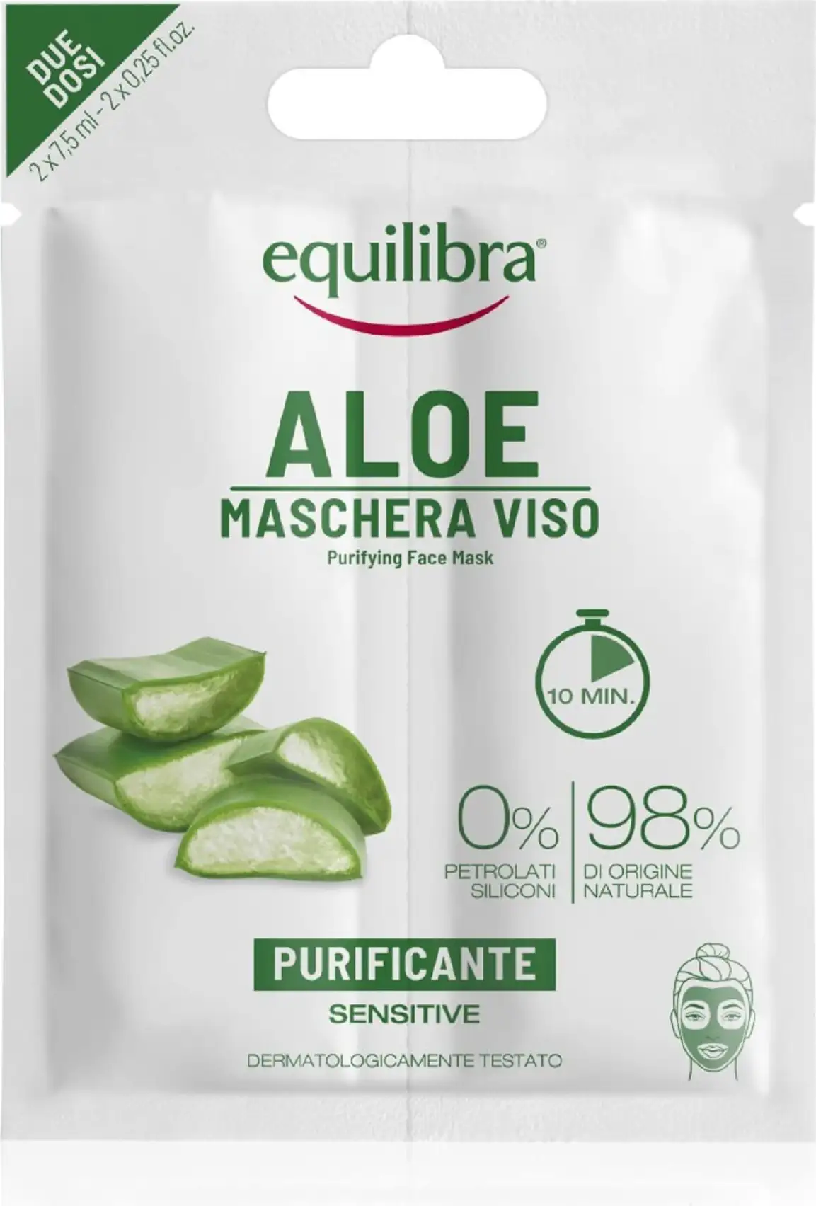 Equilibra® Aloe Purifying Face Mask is a rinse-off mask with a fresh texture that leaves facial skin clean, bright, and firm thanks to the action of the natural active ingredients in the formula. With Aloe Vera (40%) and Green Clay, it meets the needs of impure skin by reducing excess sebum and leaving facial skin more radiant. fresh and purified.