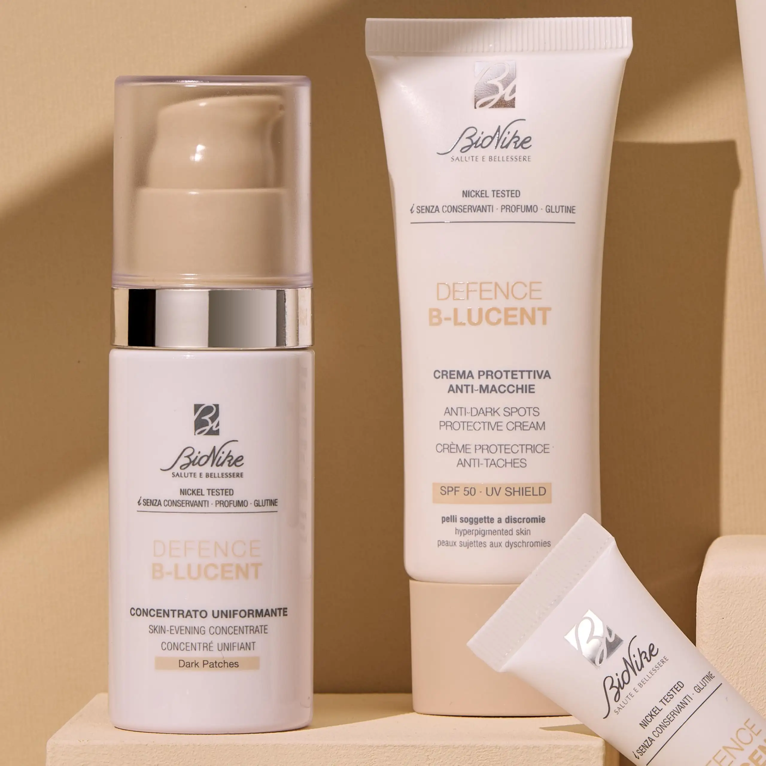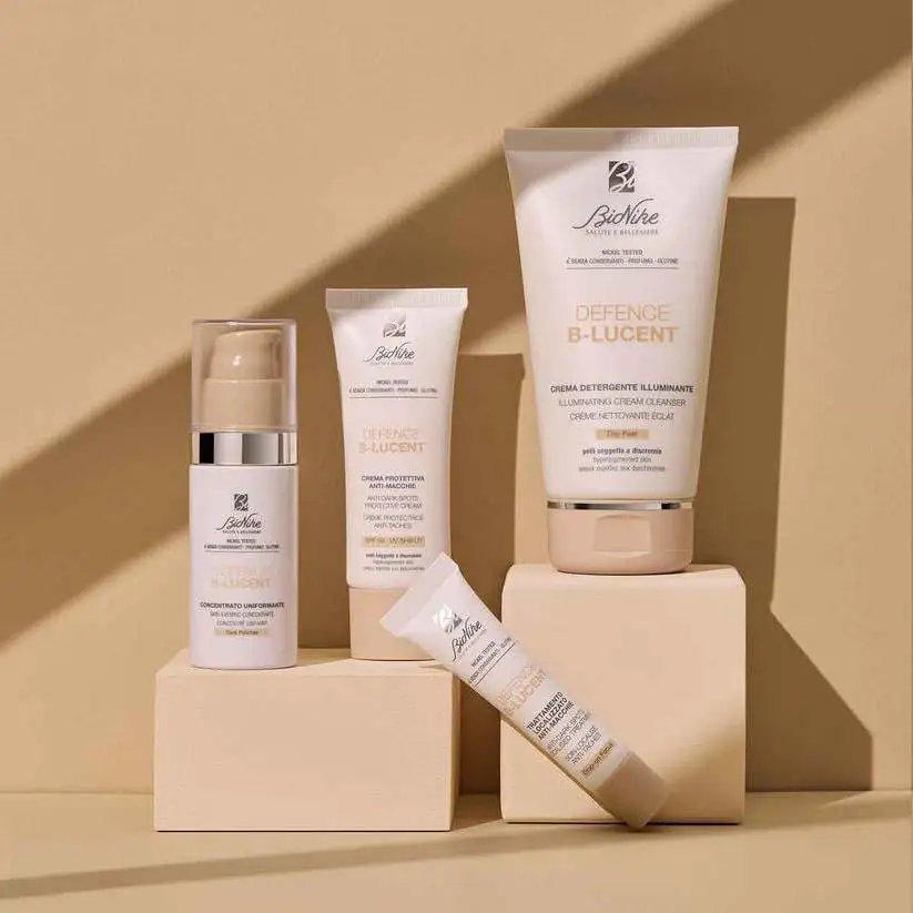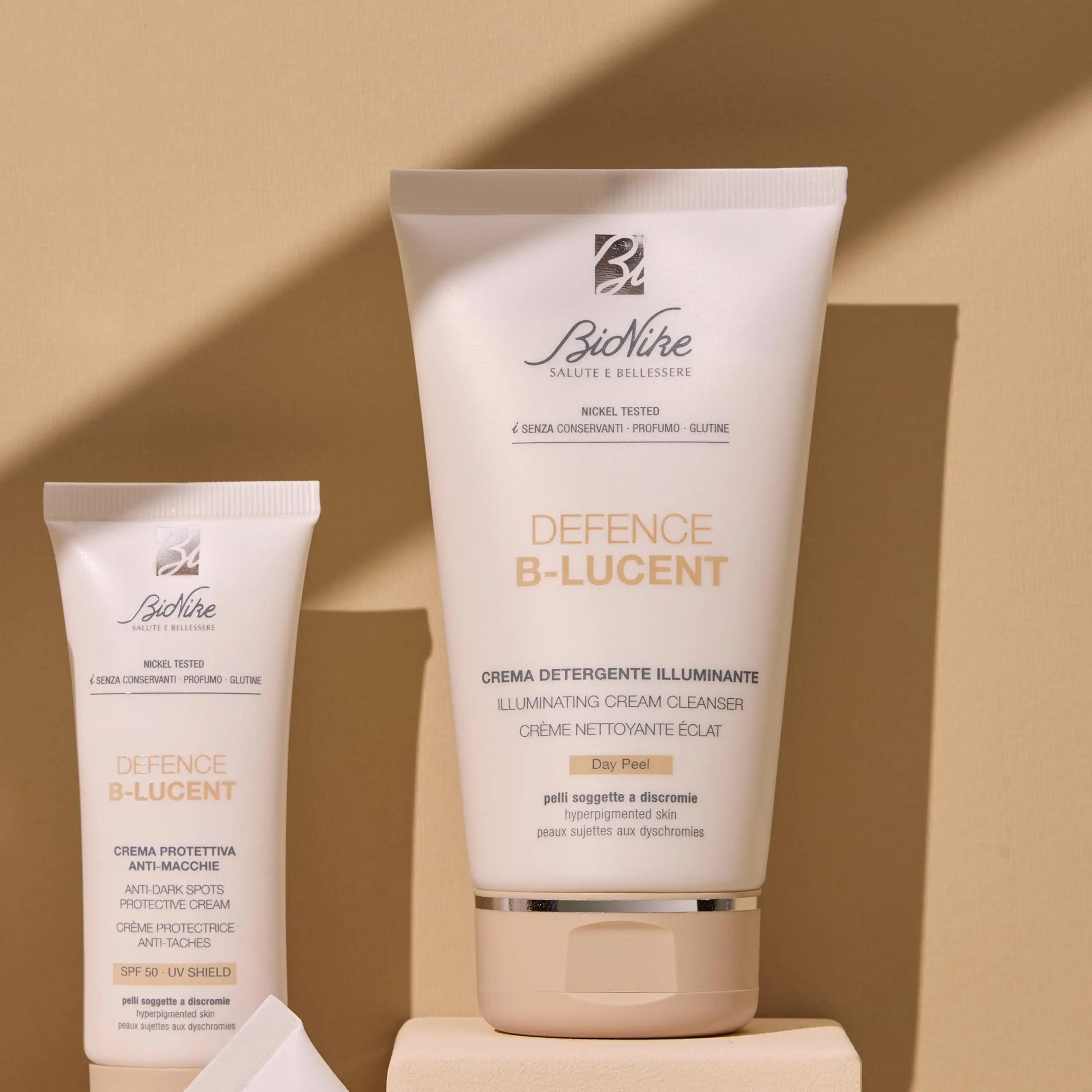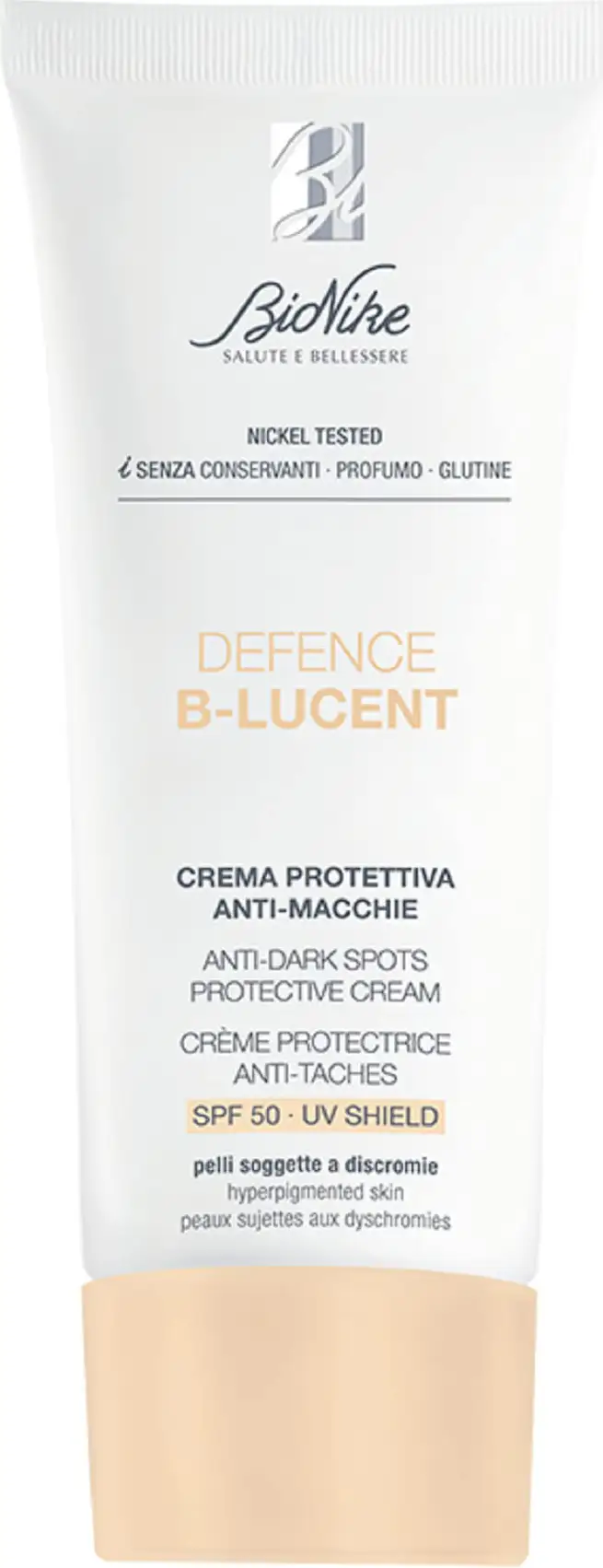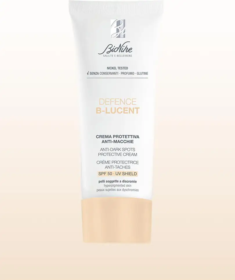 Bionike B-lucent SPF 50 anti-blemish cream, thanks to its high UV protection and the presence of special active ingredients, protects the skin daily from the risks of photo-induced hyperpigmentation, preventing the appearance of skin blemishes and counteracting the worsening of existing ones.