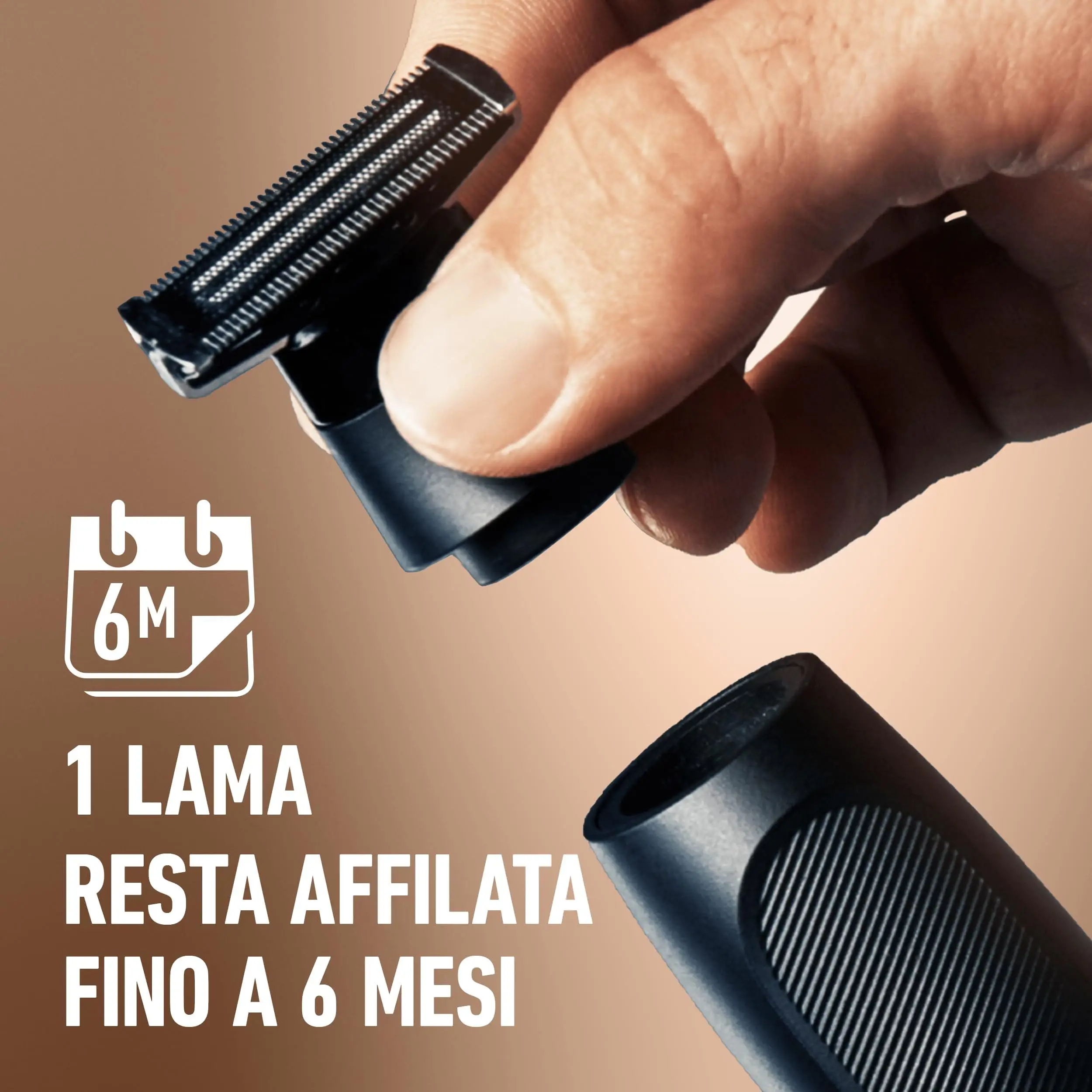 The beard trimmer's 3 interchangeable combs (1, 3, or 5 mm) allow for use up or down. It features a replaceable all-metal blade that provides up to 6 months of shaving, a pivoting shaving head that adapts to hard-to-reach areas, and a slim rubber handle for maximum precision. It's also completely waterproof and has a 45-minute battery life, making it convenient to use in the shower.