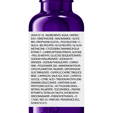 Aqua / Water / Eau, Dimethicone, Niacinamide, Glycerin, Propylene Glycol, Polysilicone-11, Silica, Bis-Peg/Ppg-16/16 Peg/Ppg-16/16 Dimethicone, Cystoseira Tamariscifolia Extract, 2-Mercaptonicotinoyl Glycine, Peg-20 Methyl Glucose Sesquistearate, Sodium Hyaluronate, Sodium Hydroxide, Sodium Thiosulfate, Carnosine, Poloxamer 338, Ammonium Polyacryloyldimethyl Taurate, Dipotassium Glycyrrhizate, Caprylic/Capric Triglyceride, Capryloyl Salicylic Acid, Caprylyl Glycol, Citric Acid, Trisodium Ethylenediamine Disuccinate, Xanthan Gum, Pentylene Glycol, Octyldodecanol, Retinyl Palmitate, Tocopherol, Pentaerythrityl Tetra-Di-T-Butyl Hydroxyhydrocinnamate, Phenoxyethanol, CI 17200 / Red 33, Parfum / Fragrance. Product ingredient lists are regularly updated. We therefore invite you to read the list on the product packaging to ensure the ingredients are suitable for your personal use.