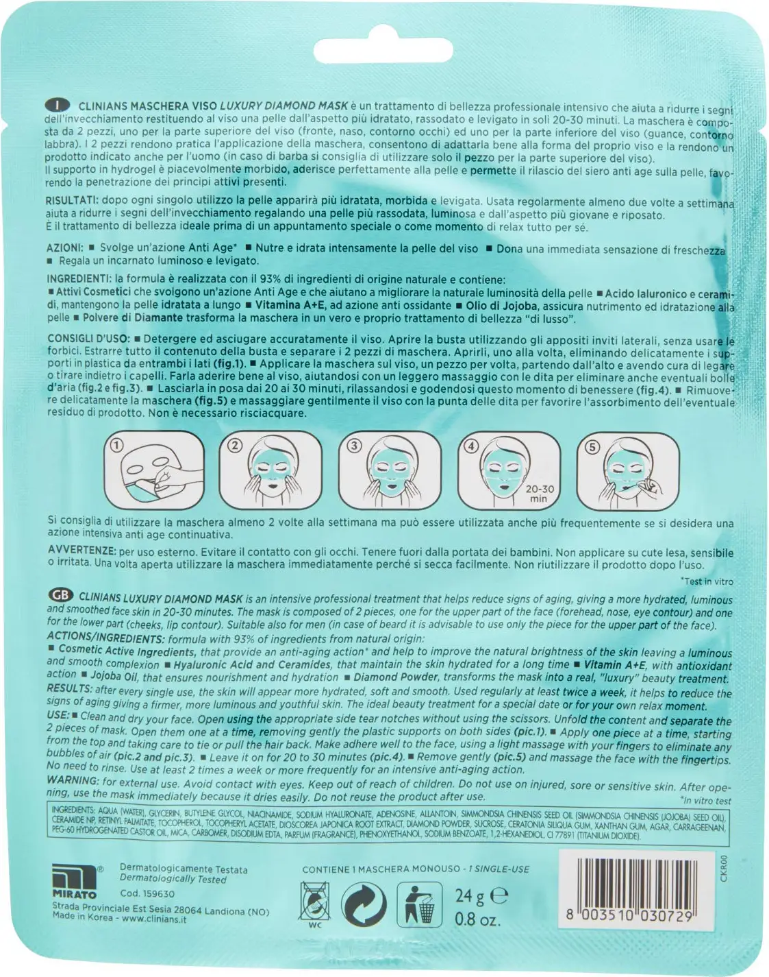 The mask is made up of 2 pieces, one for the upper part of the face (forehead, eye contour, nose) and one for the lower part (cheeks, lip contour). The 2 pieces make the application of the mask practical, allow you to adapt it well to the shape of your face and make it a product also suitable for men (in case of beards, it is recommended to use only the piece for the upper part of the face).