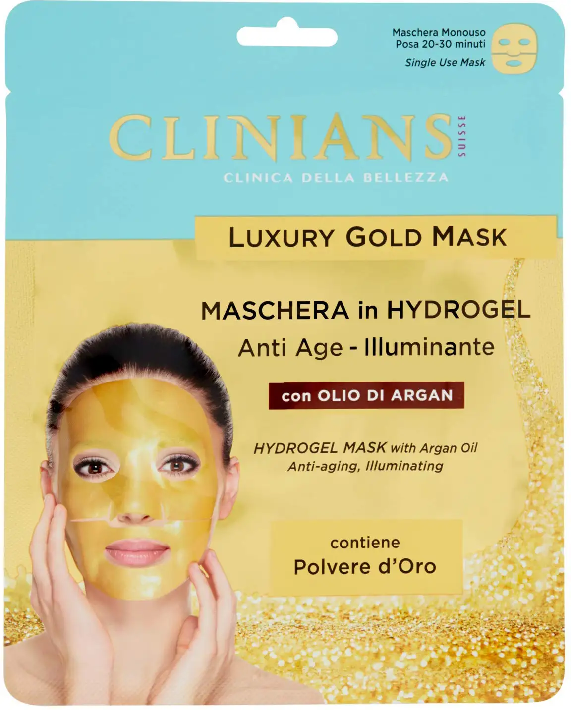 Apply the mask to your face, one piece at a time, starting from the top and taking care to tie or pull your hair back. Apply it well to your face, massaging gently with your fingers to eliminate any air bubbles.