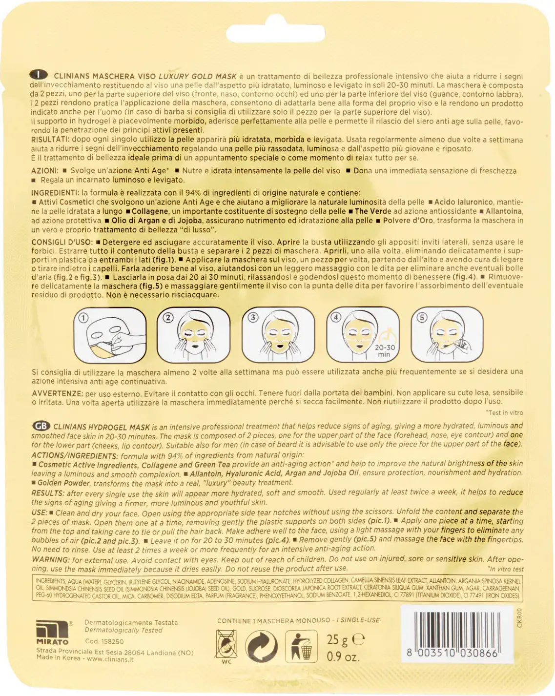 The mask is made up of 2 pieces, one for the upper part of the face (forehead, nose, eye contour) and one for the lower part of the face (cheeks, lip contour). The 2 pieces make the mask practical to apply, allow you to adapt it well to the shape of your face, and make it a product also suitable for men. It's the ideal beauty treatment before a special appointment or as a moment of relaxation just for yourself.