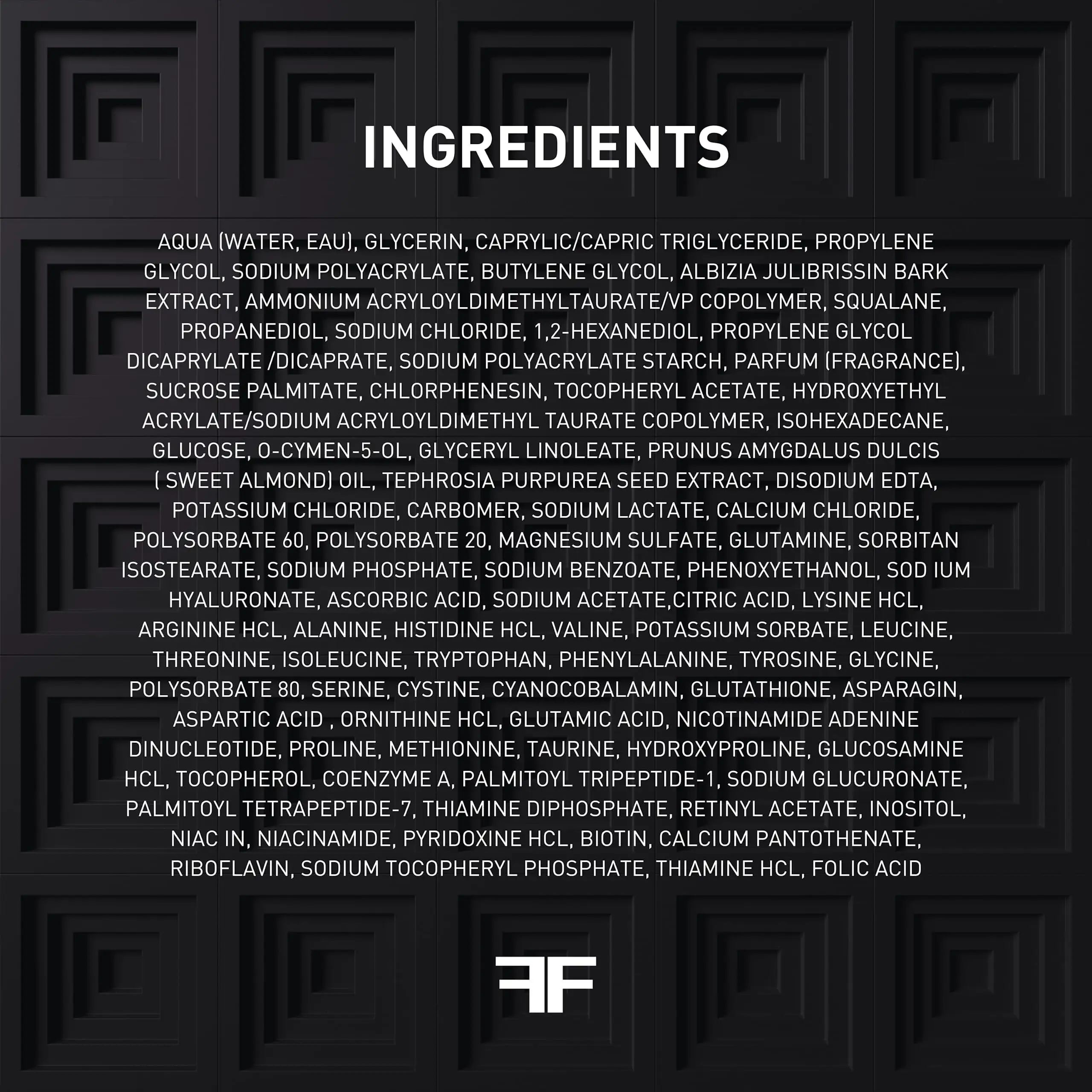Aqua (Water, Eau), Glycerin, Caprylic/Capric Triglyceride, Propylene Glycol, Sodium Polyacrylate, Butylene Glycol, Albizia Julibrissin Bark Extract, Ammonium Acryloyldimethyltaurate/Vp Copolymer, Squalane, Propanediol, Sodium Chloride, 1,2-Hexanediol, Propylene Glycol Dicaprylate/Dicaprate, Sodium Polyacrylate Starch, Parfum (Fragrance), Sucrose Palmitate, Chlorphenesin, Tocopheryl Acetate, Hydroxyethyl Acrylate/Sodium Acryloyldimethyl Taurate Copolymer, Isohexadecane, Glucose, O-Cymen-5-Ol, Glyceryl Linoleate, Prunus Amygdalus Dulcis (Sweet Almond) Oil, Tephrosia Purpurea Seed Extract, Disodium Edta, Potassium Chloride, Carbomer, Sodium Lactate, Calcium Chloride, Polysorbate 60, Polysorbate 20, Magnesium Sulfate, Glutamine, Sorbitan Isostearate, Sodium Phosphate, Sodium Benzoate, Phenoxyethanol, Sodium Hyaluronate, Ascorbic Acid, Sodium Acetate, Citric Acid, Lysine Hcl, Arginine Hcl, Alanine, Histidine Hcl, Valine, Potassium Sorbate, Leucine, Threonine, Isoleucine, Tryptophan, Phenylalanine, Tyrosine, Glycine, Polysorbate 80, Serine, Cystine, Cyanocobalamin, Glutathione, Asparagine, Aspartic Acid, Ornithine Hcl, Glutamic Acid, Nicotinamide Adenine Dinucleotide, Proline, Methionine, Taurine, Hydroxyproline, Glucosamine Hcl, Tocopherol, Coenzyme A, Palmitoyl Tripeptide-1, Sodium Glucuronate, Palmitoyl Tetrapeptide-7, Thiamine Diphosphate, Retinyl Acetate, Inositol, Niacin, Niacinamide, Pyridoxine Hcl, Biotin, Calcium Pantothenate, Riboflavin, Sodium Tocopheryl Phosphate, Thiamine Hcl, Folic Acid.