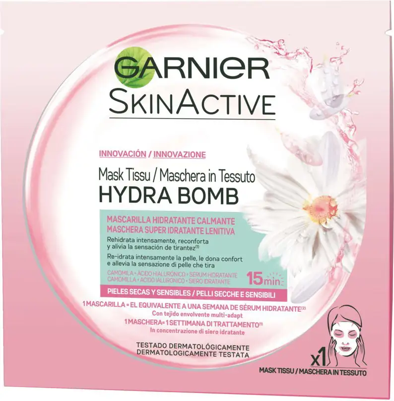 HYDRA BOMB Tissue Mask for Dry and Sensitive Skin is soaked in a super-hydrating and soothing treatment enriched with chamomile extract, known for its calming properties on the skin. It acts as a hydrating pack that provides relief to tight skin. The skin is intensely rehydrated, soft, with a pleasant sensation of comfort.