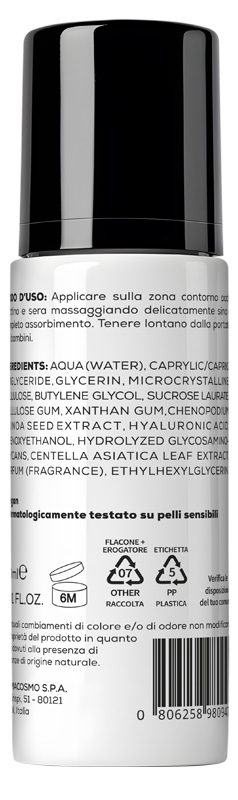 Hydrating eye contour fluid, formulated with hyaluronic acid, centella asiatica extract and quinoa seed extract.