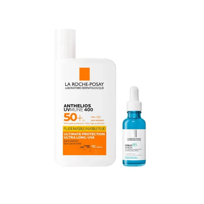 The La Roche-Posay Anthelios UV Mune 400 Invisible Fluid SPF50+ + Hyalu B5 Serum set represents the definitive solution for impeccable daily sun protection and deep facial skin care. Ideal for all skin types, including sensitive skin, this duo offers a comprehensive approach to keeping skin protected, hydrated, and visibly regenerated.