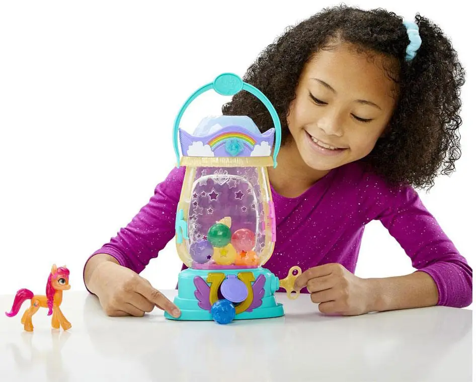 Includes a 3-inch-scale, orange Sunny Star Scout pony figure with a pink plastic mane; the figure and lantern are inspired by the My Little Pony: A New Generation movie.
