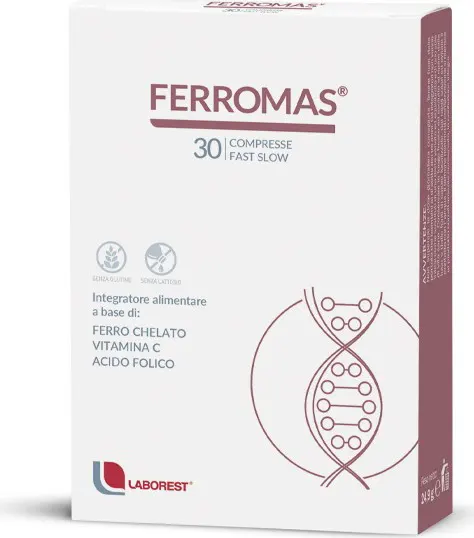 The iron present in Ferromas® is chelated; this particular pharmaceutical technique, combined with the fast slow release of the triple-layer tablets, allows for maximizing absorption, avoiding gastrointestinal problems such as gastric heaviness, gastroesophageal reflux, and diarrhea, which are typical of iron supplements.