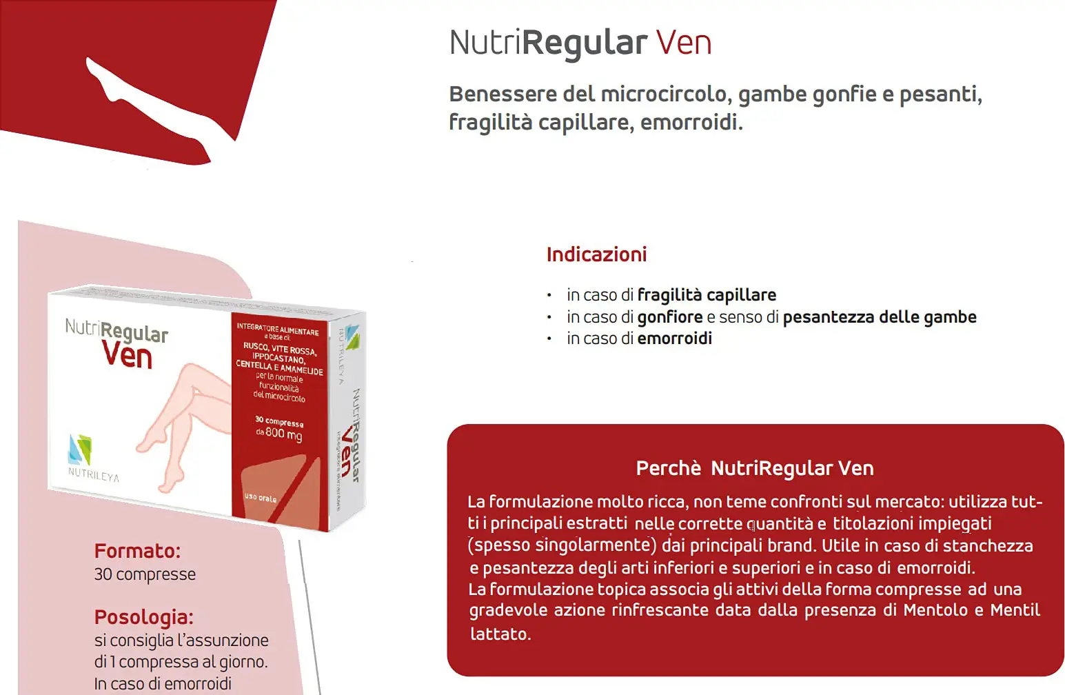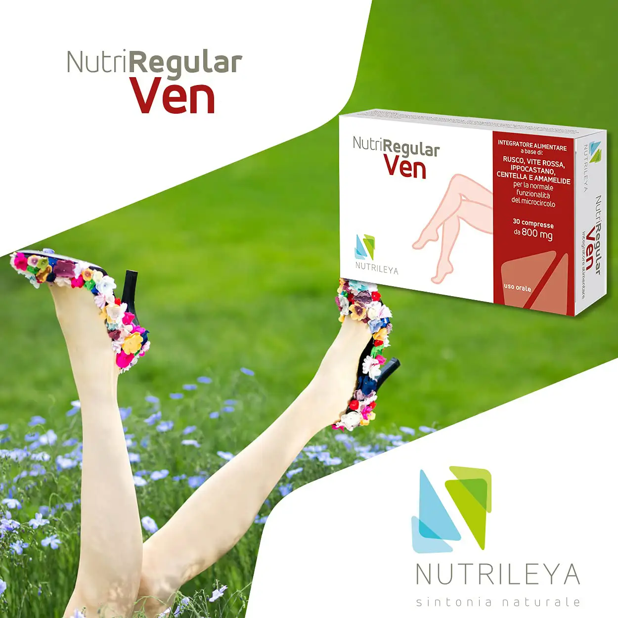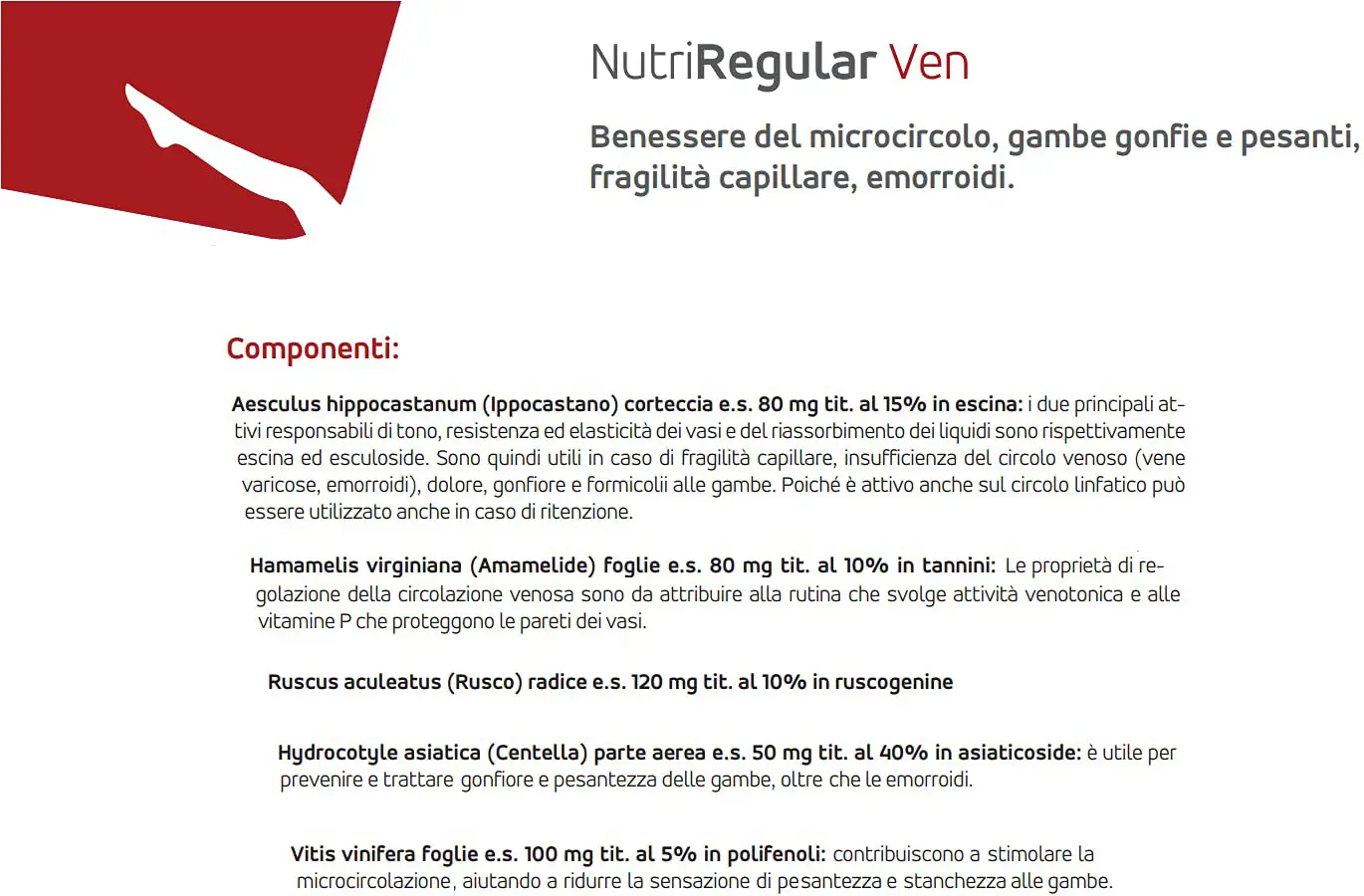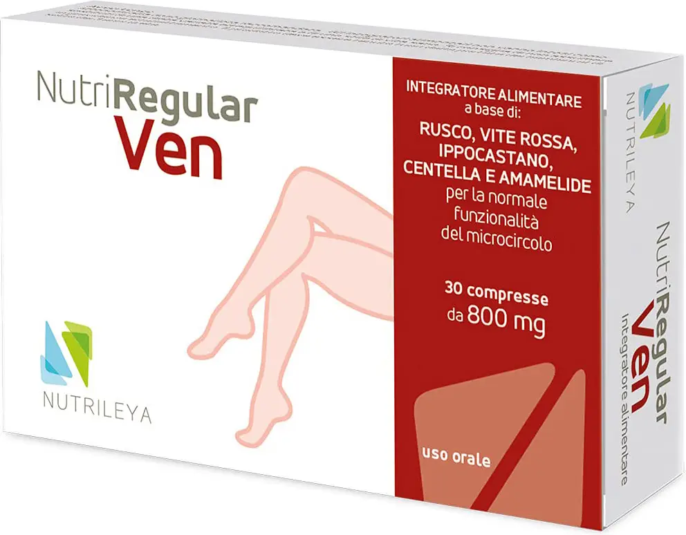 Nutriregular ven is a food supplement based on Butcher's Broom, Red Vine, Horse Chestnut, Centella and Witch Hazel for the normal functioning of the microcirculation and heavy legs.