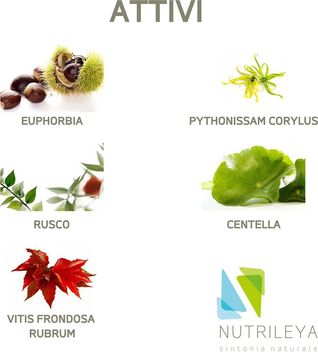 Bulking agent: dicalcium phosphate; Butcher's Broom (Ruscus aculeatus L.) root dry extract tit. at 10% in ruscogenin, red vine (Vitis vinifera L.) leaves dry extract tit. at 5% in polyphenols, Centella (Centella asiatica L.) aerial parts dry extract tit. 20% triterpene derivatives, bulking agent: microcrystalline cellulose, witch hazel (Hamamelis virginiana L.) leaf dry extract titrated to 10% tannins, horse chestnut (Aesculus hippocastanum L.) bark dry extract titrated to 20% escin, stabilizers: mono- and diglycerides of fatty acids, cross-linked sodium carboxymethylcellulose; anti-caking agents: silicon dioxide, magnesium salts of fatty acids.