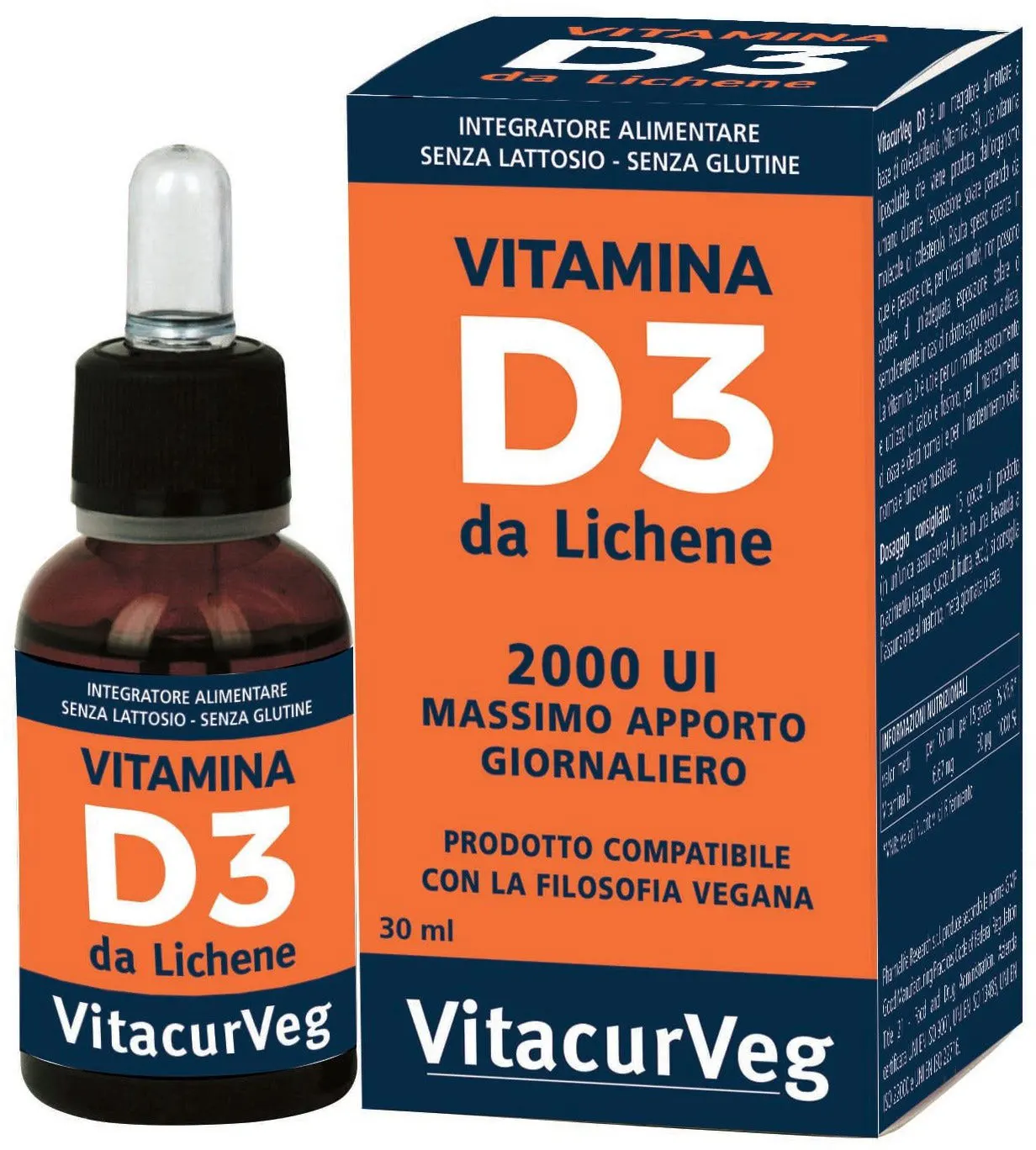 Vitamin D3 from lichen is a food supplement in drops based on cholecalciferol (vitamin D3) from lichen useful for integrating vitamin D deficiencies.